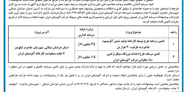 موضوع پروژه : تامین سرمایه کارخانه تولید شمش آلومینیوم جاجرم به ظرفیت ۴۰ هزار تن